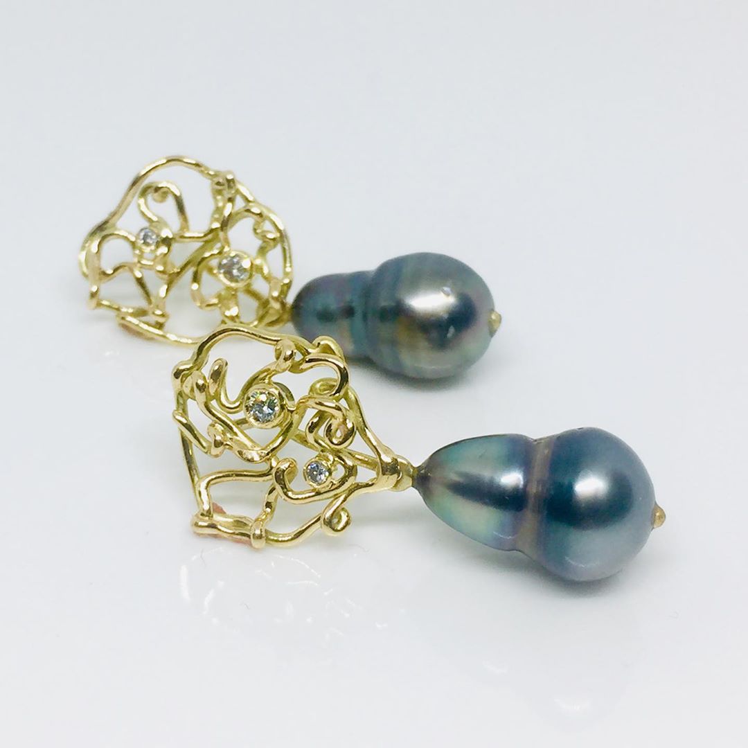 Twisted 18 carat gold earrings with diamonds and Tahiti-pearl. The earrings can also be worn without the pearls.