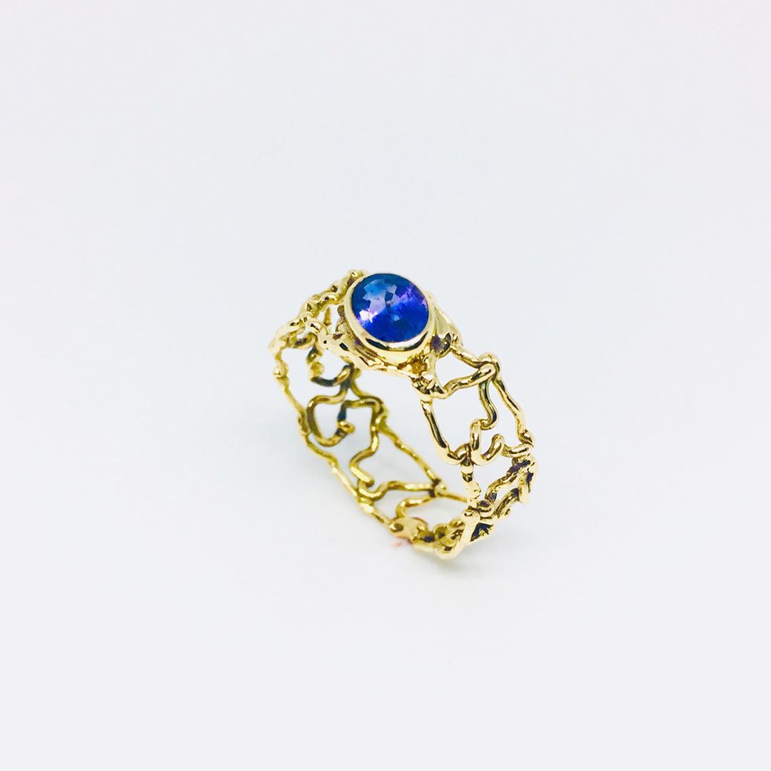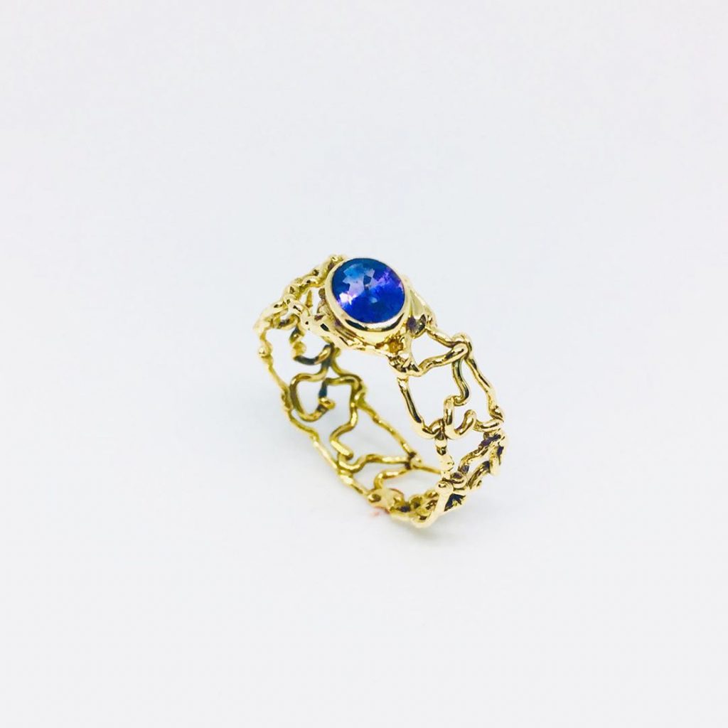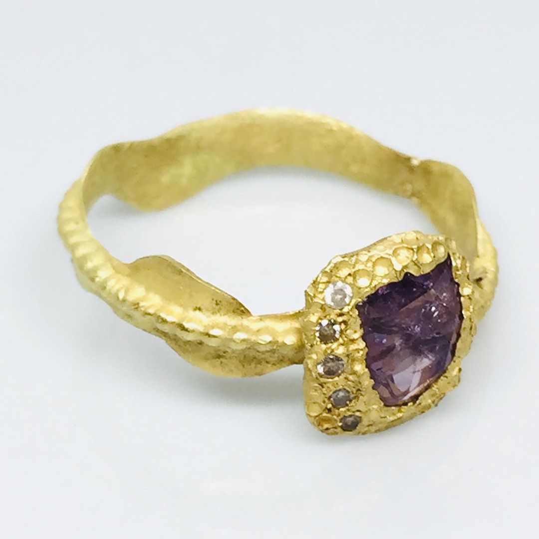 I made this ring from 18 carat gold adorned with diamonds and corundum. Corundum is a general name for colored sapphire.