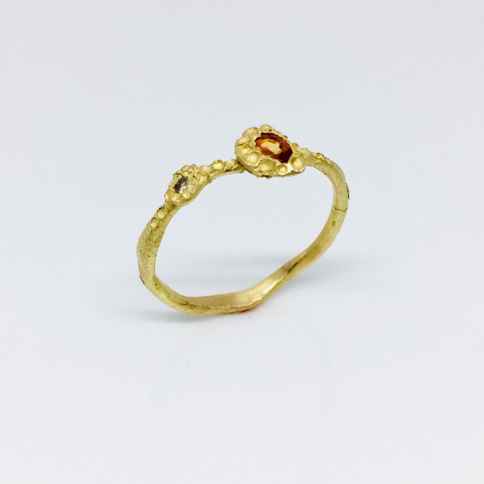 I just want something small….then this ring is for You! Handcrafted, one of a kind, 18carat gold with a orange sapphire and coloured diamond.